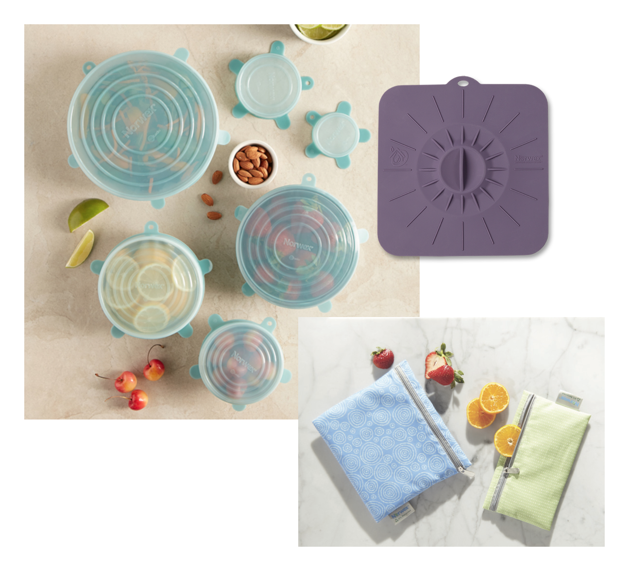 Elastīgo vāku komplekts UN kvadrātvāks UN Uzglabāšanas maisiņi | Elastīgo silikona vāku komplekts Parūpējies par ēdiena ilgstošāku svaigumu un sulīgumu, izmantojot elastīgos, izturīgos silikona vāciņus. Tos var uzlikt katliem, pannām, traukiem vai tieši uz pārgrieztiem augļiem vai dārzeņiem, lai tie saglabā sākotnējo garšu, izskatu un tekstūru. Viegli lietojami un mazgājami. Komplektā 6 gab. Diametrs: 6,5 cm; 9,5 cm; 12,5 cm; 14,5 cm; 16,5 cm; 21 cm Silikona vāks kvadrātveida Norwex krāsainie silikona vāciņi hermetizē jebkuru trauku ar gludu virsmu, tādējādi saglabājot ēdienu svaigu ilgāku laiku. Silikons nekaitē ēdienam un ir karstumizturīgs, tāpēc vākus var izmantot gatavojot uz plīts, cepeškrāsnī un sildot ēdienu mikroviļņu krāsnī. Var likt arī saldētavā. Var mazgāt trauku mazgājamā mašīnā. Nesatur BPA. Auduma pārtikas uzglabāšanas maisiņi Šie ērtie un skaistie maisiņi ir ar pārtikai drošu, ūdensizturīgu oderi. Tie ir viegli un ērti lietojami, tajos var uzglabāt garšaugus, vai izmantot, lai ņemtu līdzi uzkodas, sviestmaizes, augļus vai citus našķus. Var mazgāt trauku mazgājamajā mašīnā. Nesatur PA, PVC un ftalātus. Maciņi ir izturīgi un atkārtoti lietojami. Var tikt izmantoti arī citu piederumu uzglabāšanai. Komplektā 2 gab. Izmēri: 20 x 18 cm (lielais) 20 x 11 cm (mazais) |